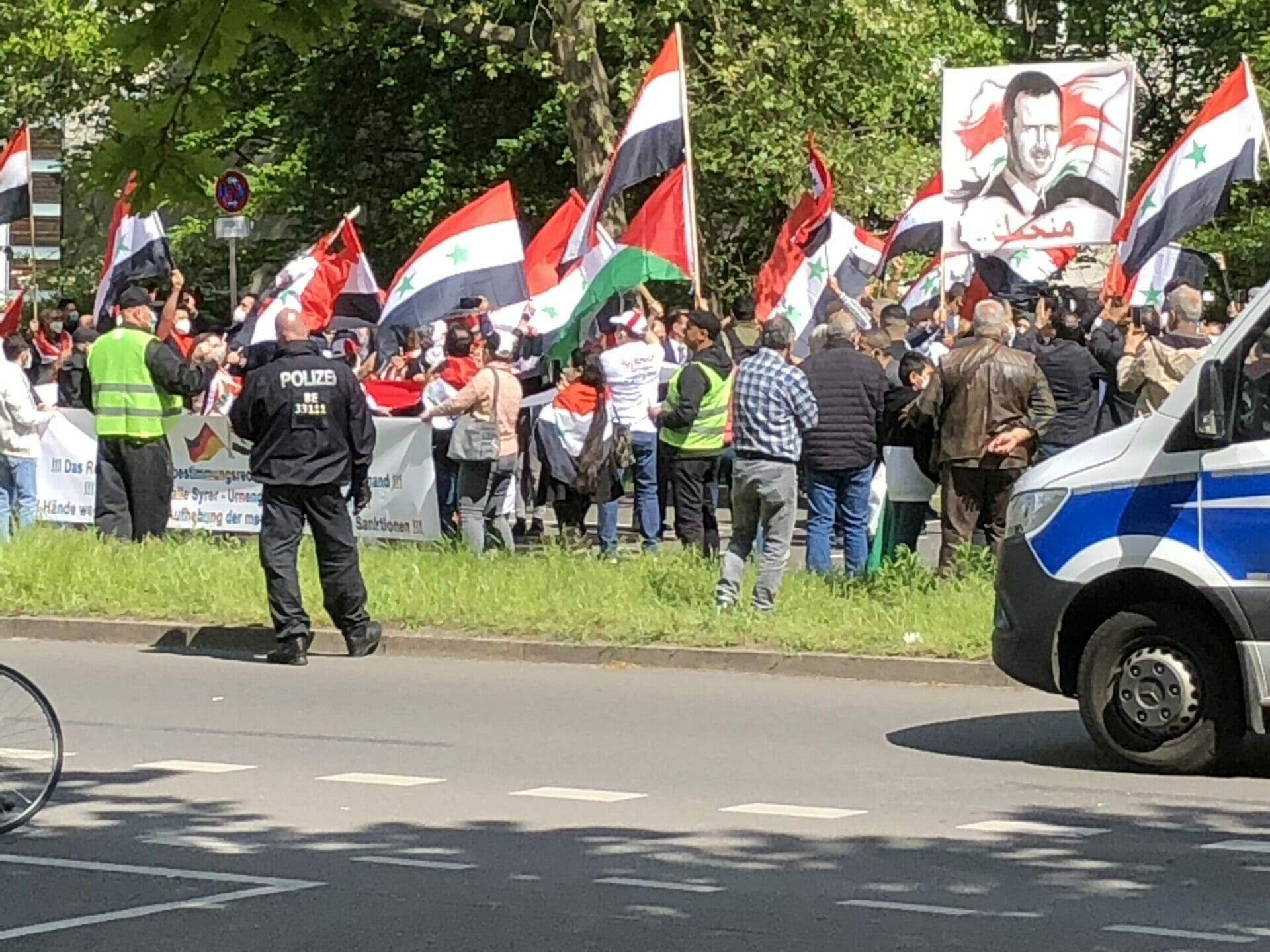 مؤيدو الأسد انتقدوا قرار الحكومة الألمانية الأخير. في ألمانيا لا يمكنهم المشاركة في الانتخابات الرئاسية في السفارة. وحمل المتظاهرون لافتات وصورا للأسد وأرادوا انتخاب رئيسهم والإدلاء بأصواتهم لصالحه. وقال احد الحاضرين “ليس لدينا سوى رئيس واحد وسنواصل دعمه”.