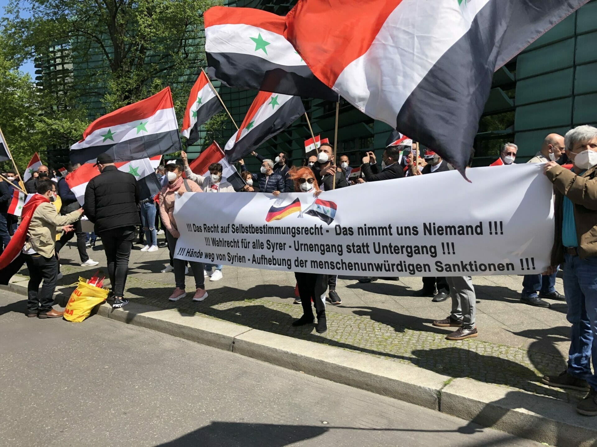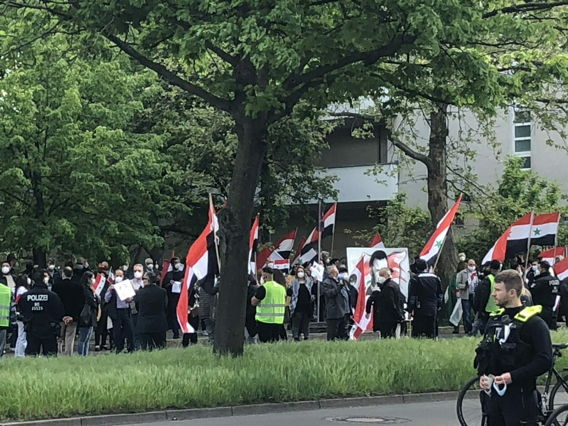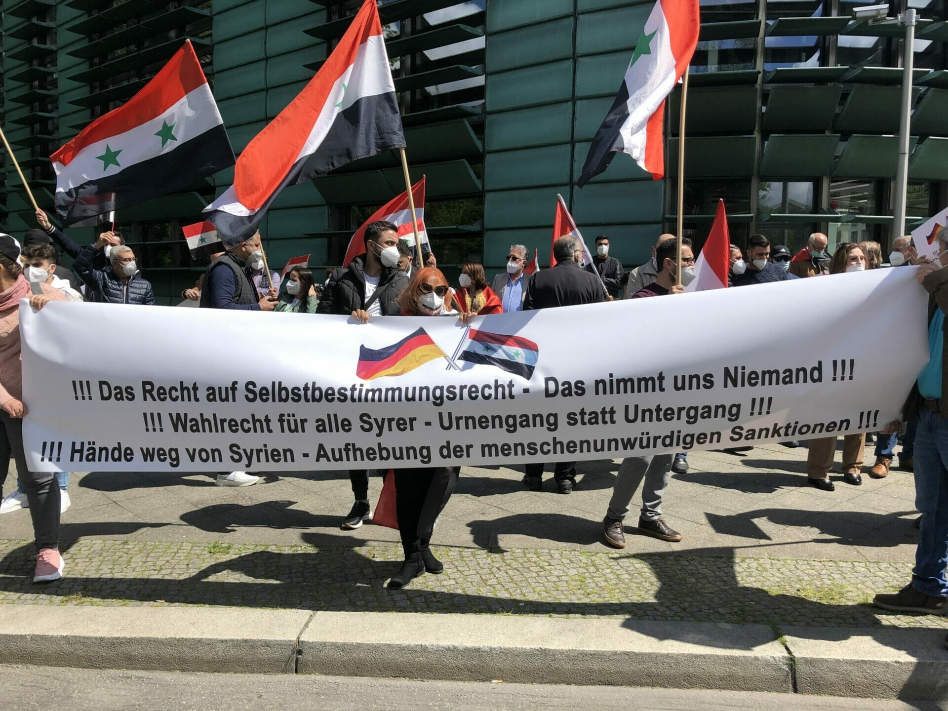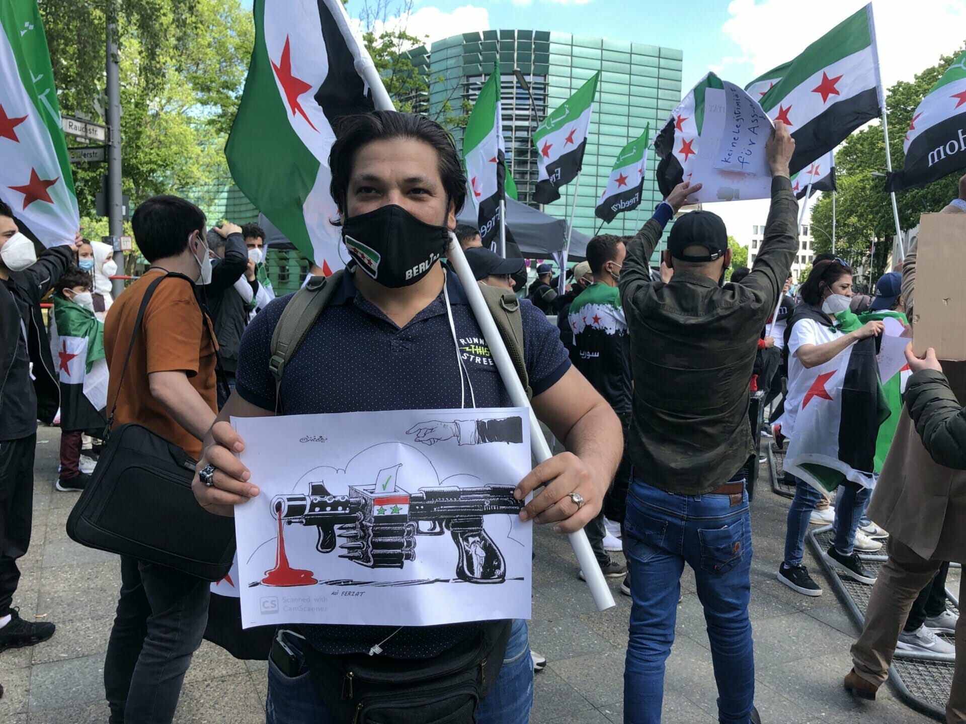 وقال احد المشاركين “نحن هنا لنشكر المانيا على حظرها الانتخابات الرئاسية في السفارة السورية”. كما أنها تريد إرسال إشارة ضد مؤيدي الأسد الذين جاءوا إلى برلين من جميع أنحاء ألمانيا “وكذلك إرسال رسالة إلى العالم بأن هذه الانتخابات الرئاسية ليست شرعية ويجب على الأسد المغادرة”.