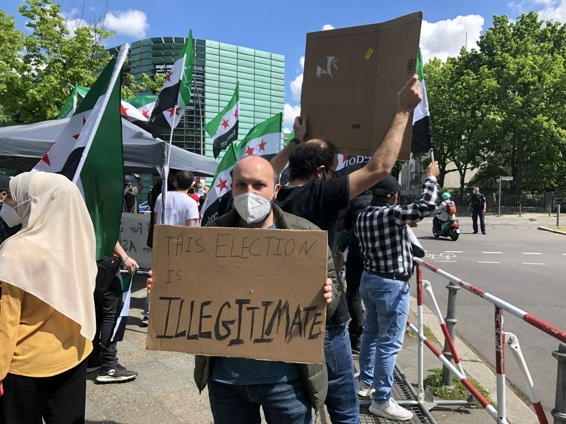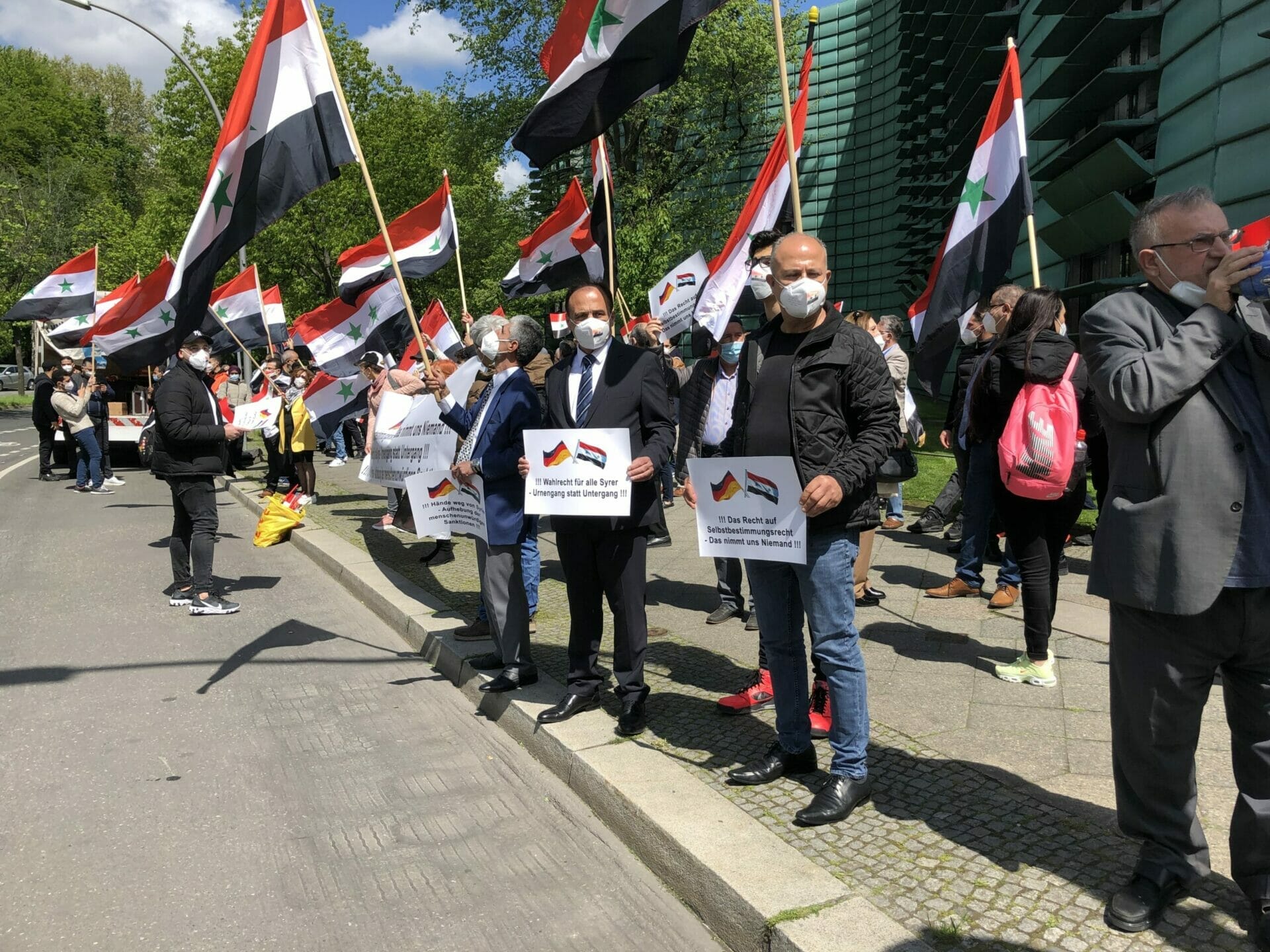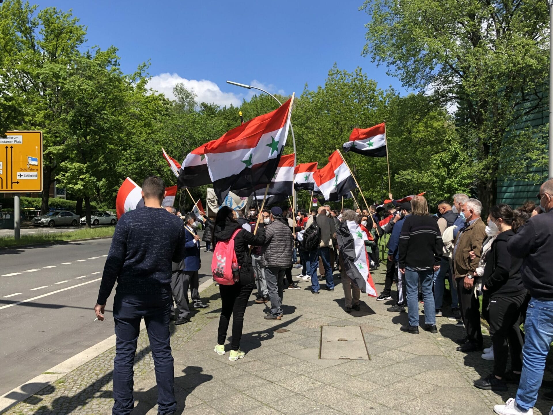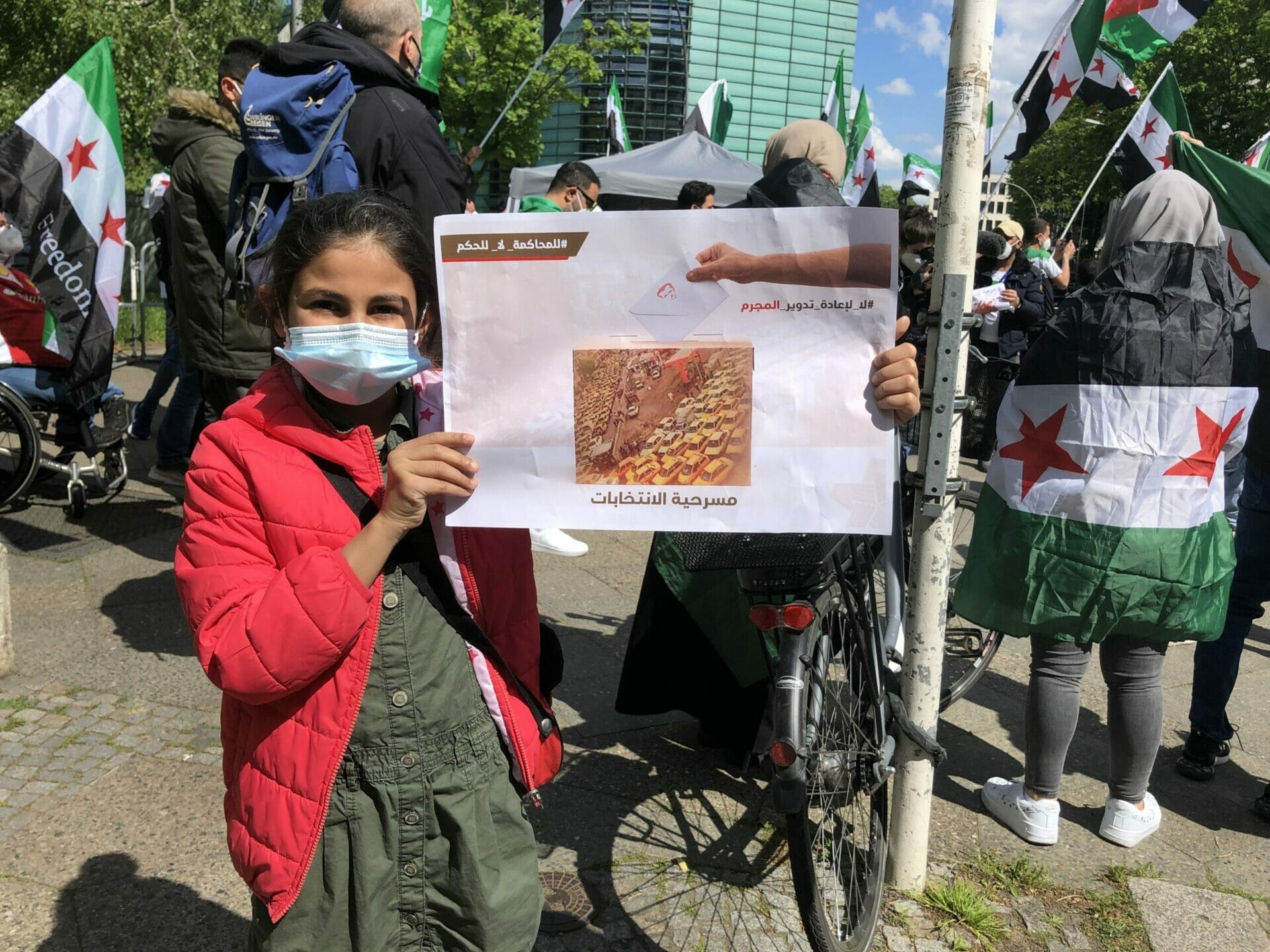 وقال احد المشاركين “نحن هنا لنشكر المانيا على حظرها الانتخابات الرئاسية في السفارة السورية”. كما أنها تريد إرسال إشارة ضد مؤيدي الأسد الذين جاءوا إلى برلين من جميع أنحاء ألمانيا “وكذلك إرسال رسالة إلى العالم بأن هذه الانتخابات الرئاسية ليست شرعية ويجب على الأسد المغادرة”.