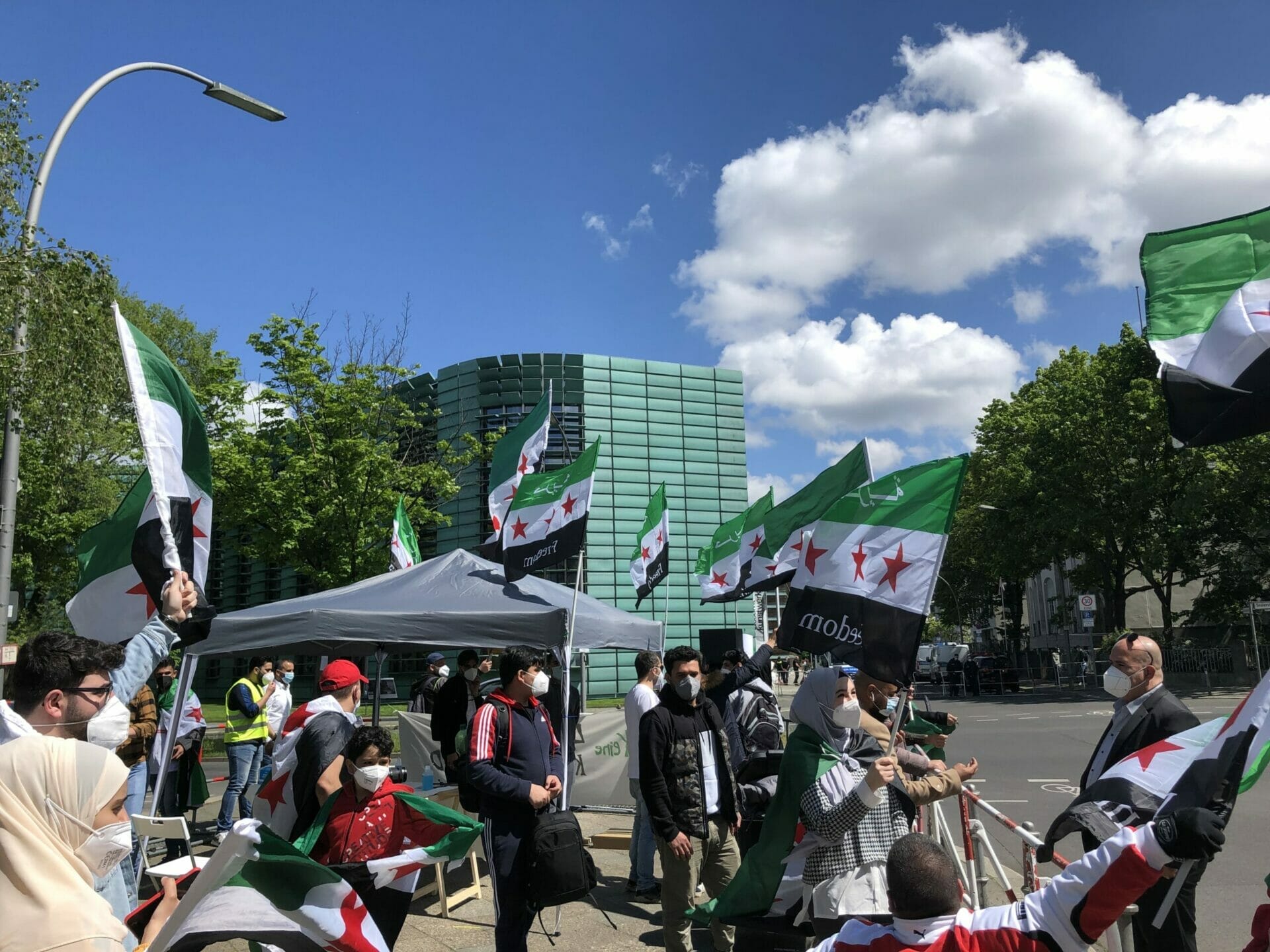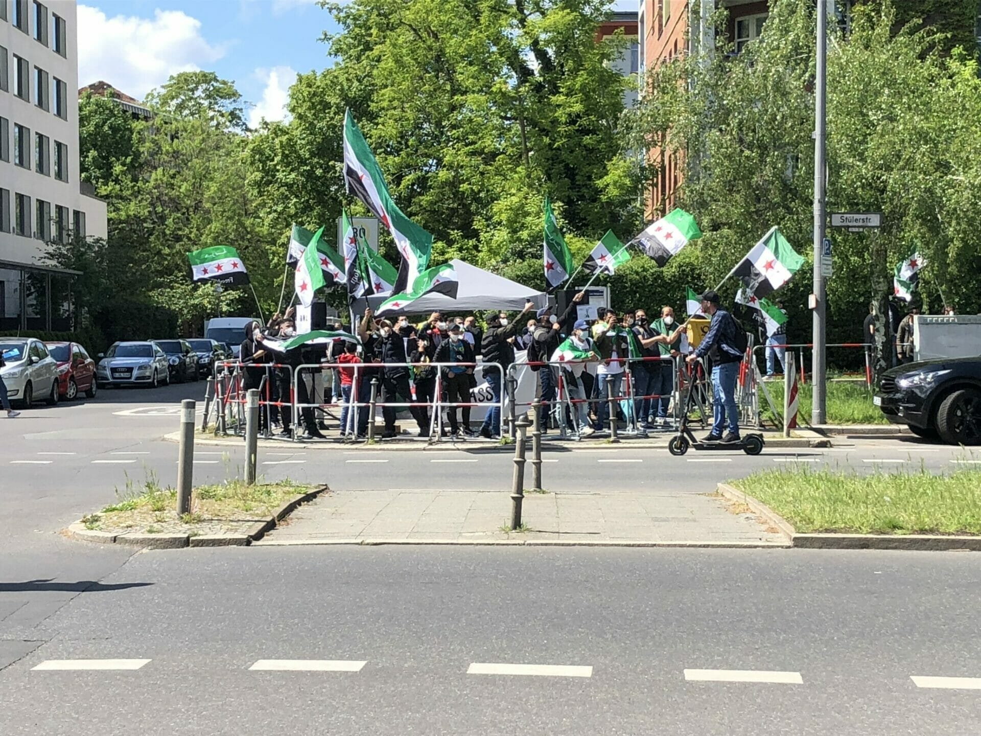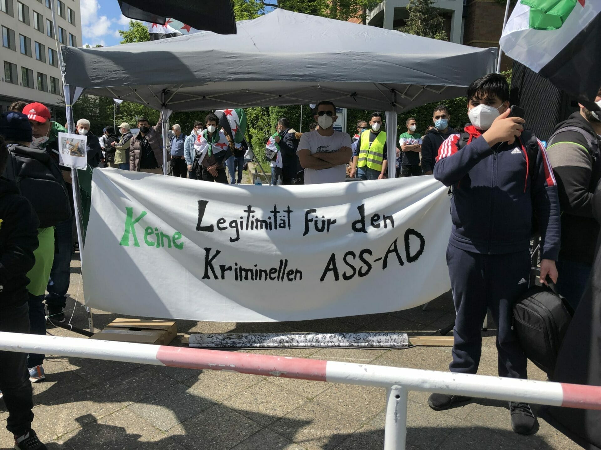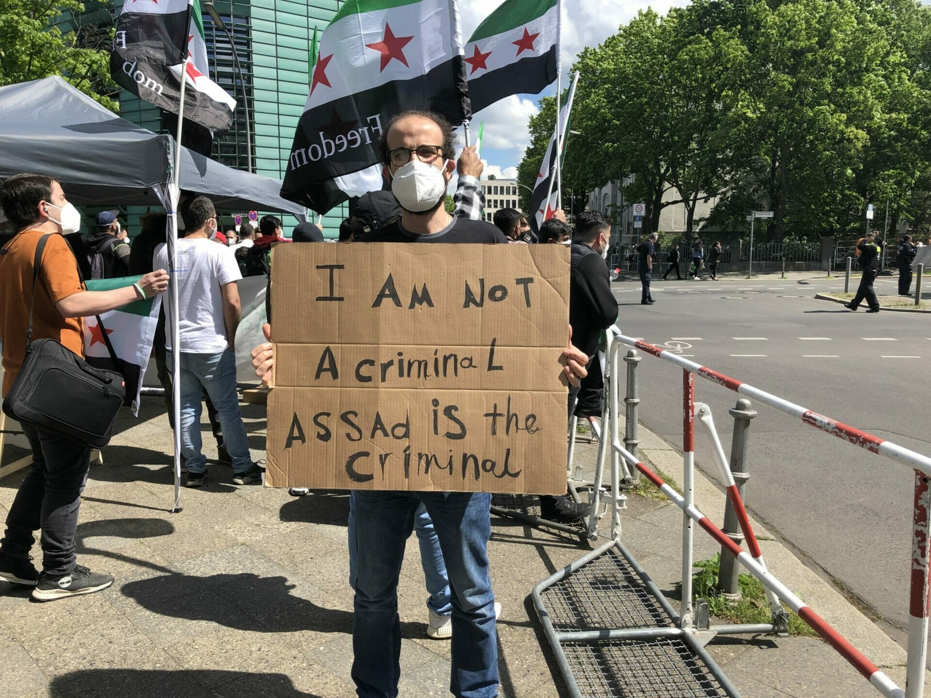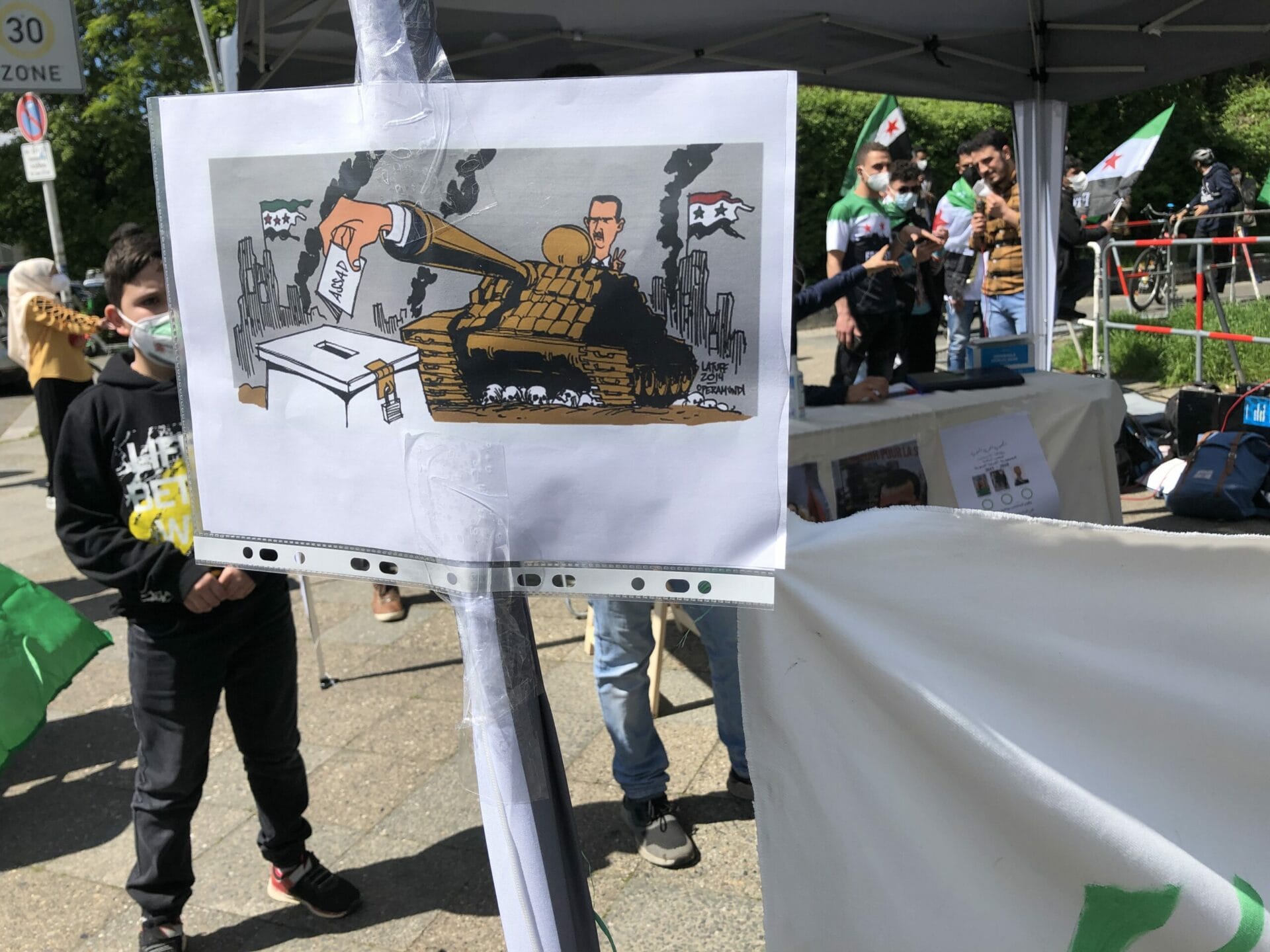 وقال احد المشاركين “نحن هنا لنشكر المانيا على حظرها الانتخابات الرئاسية في السفارة السورية”. كما أنها تريد إرسال إشارة ضد مؤيدي الأسد الذين جاءوا إلى برلين من جميع أنحاء ألمانيا “وكذلك إرسال رسالة إلى العالم بأن هذه الانتخابات الرئاسية ليست شرعية ويجب على الأسد المغادرة”.