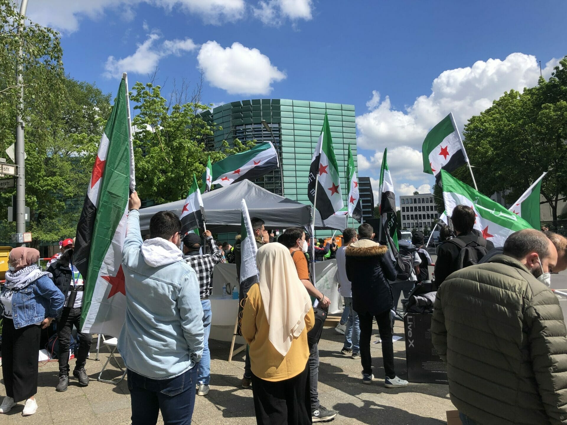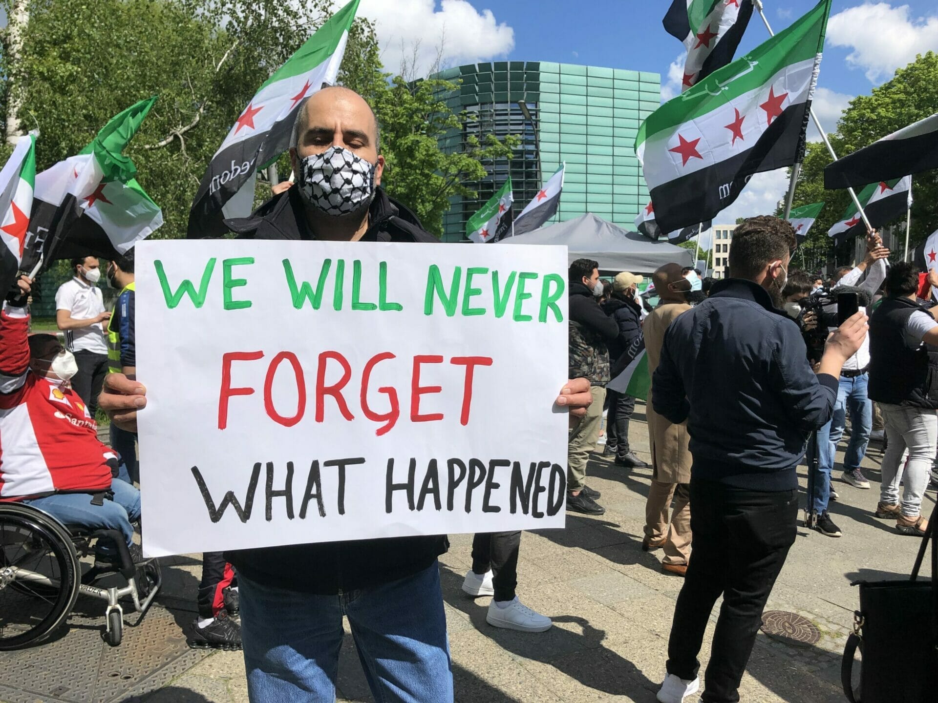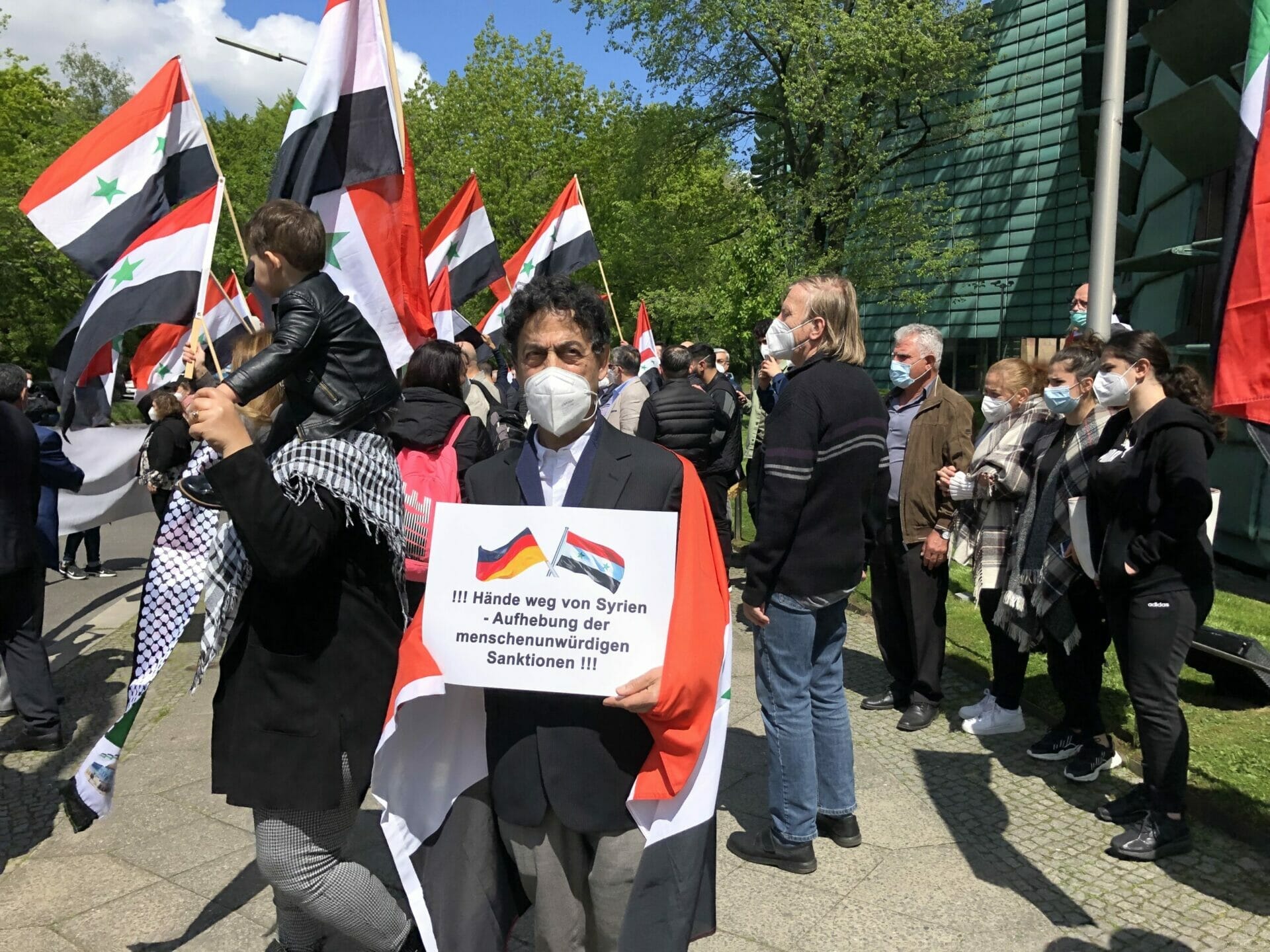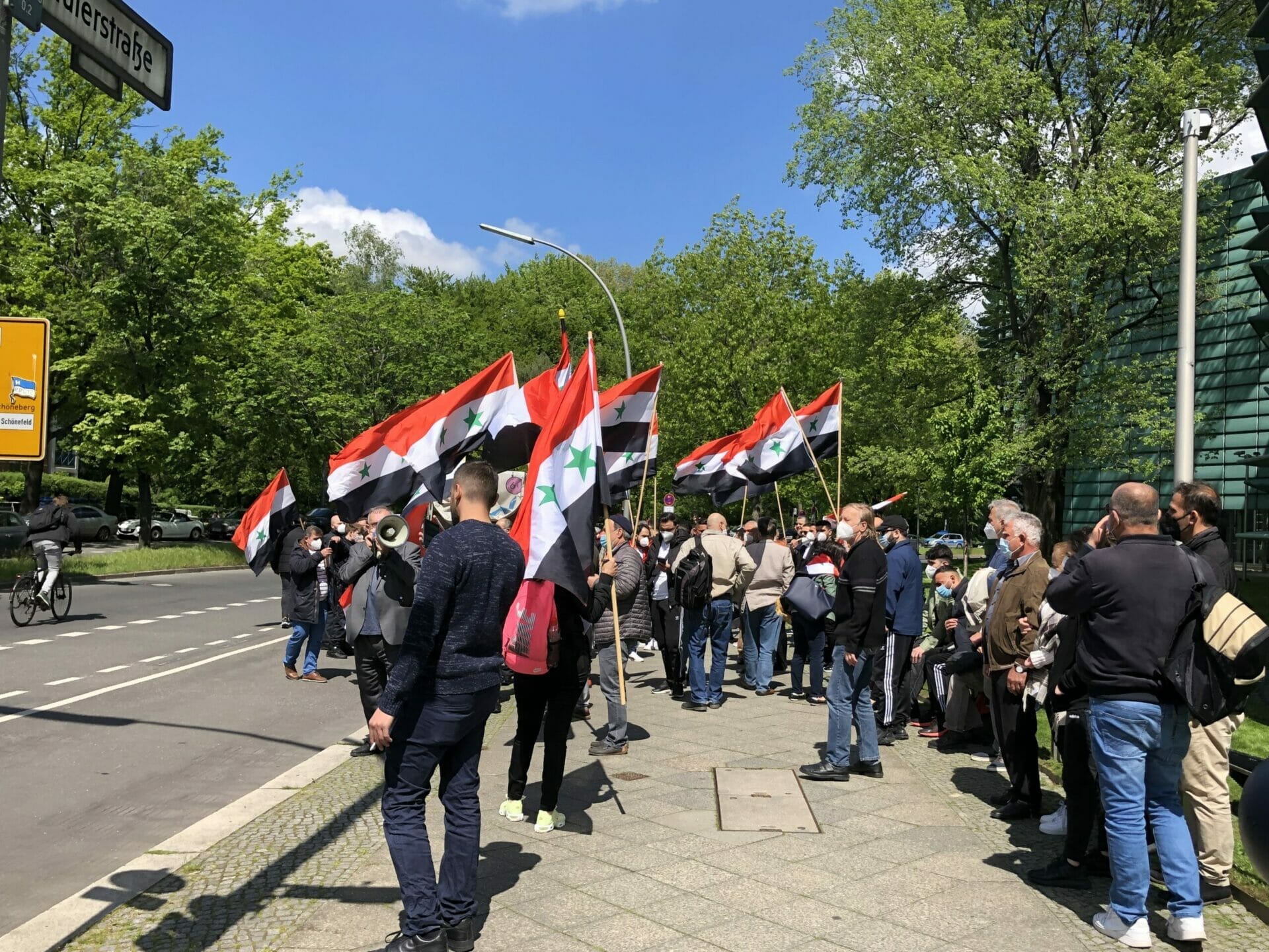 وقال احد المشاركين “نحن هنا لنشكر المانيا على حظرها الانتخابات الرئاسية في السفارة السورية”. كما أنها تريد إرسال إشارة ضد مؤيدي الأسد الذين جاءوا إلى برلين من جميع أنحاء ألمانيا “وكذلك إرسال رسالة إلى العالم بأن هذه الانتخابات الرئاسية ليست شرعية ويجب على الأسد المغادرة”.