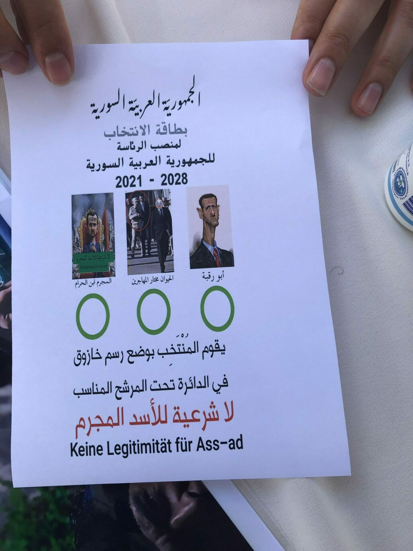 فقد أجرى المتظاهرون انتخابات رمزية, فقد كان الأسد على ورقة الاقتراع ثلاث مرات وهي إشارة إلى المرشحين الثلاثة، الذين يؤيدان ايضا الرئيس. في الانتخابات السابقة في عام 2014، كان من الممكن انتخاب فقط ب “نعم” أو “لا”. لذلك اختاروا هذه المرة أن تكون القمامة بمثابة صندوق الاقتراع.