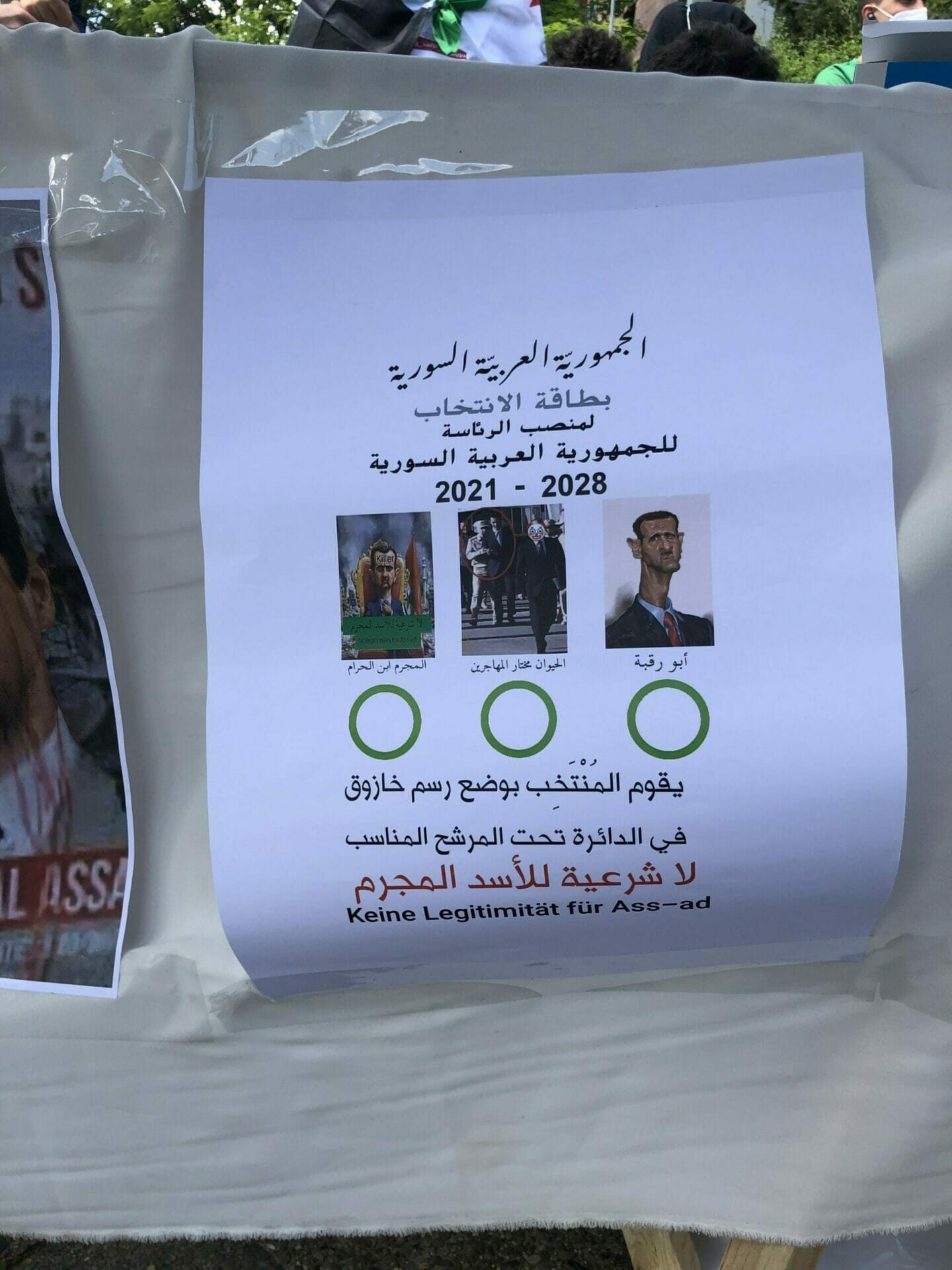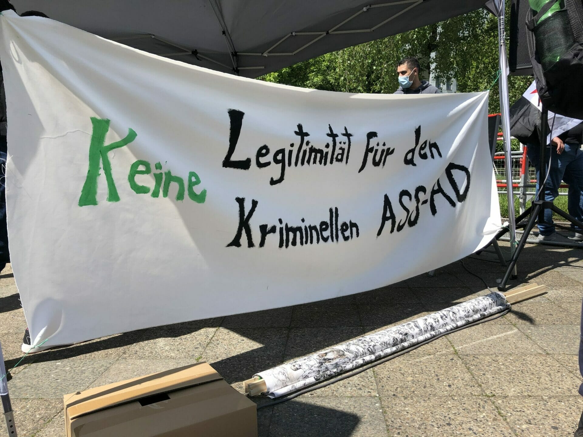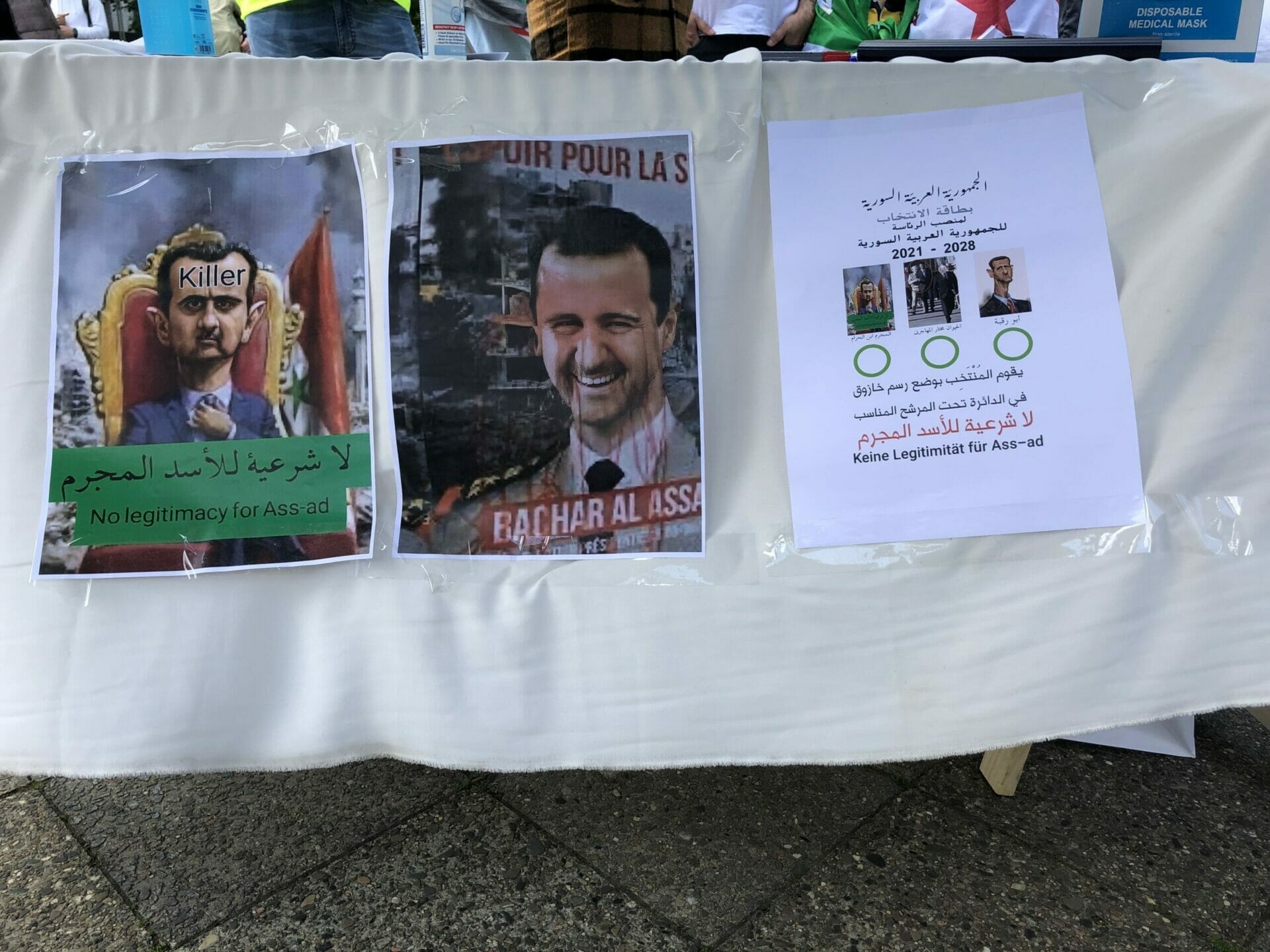 وعلى الجانب الآخر، كان هناك معارضون للأسد المتظاهرون رحبوا بقرار الحكومة الألمانية حظر الانتخابات في السفارة السورية. وشددوا على أن هذه الانتخابات الرئاسية مجرد مهزلة. وانتقدوا الأسد باعتباره قاتل ومجرم حرب و يجب محاكمته في المحكمة.